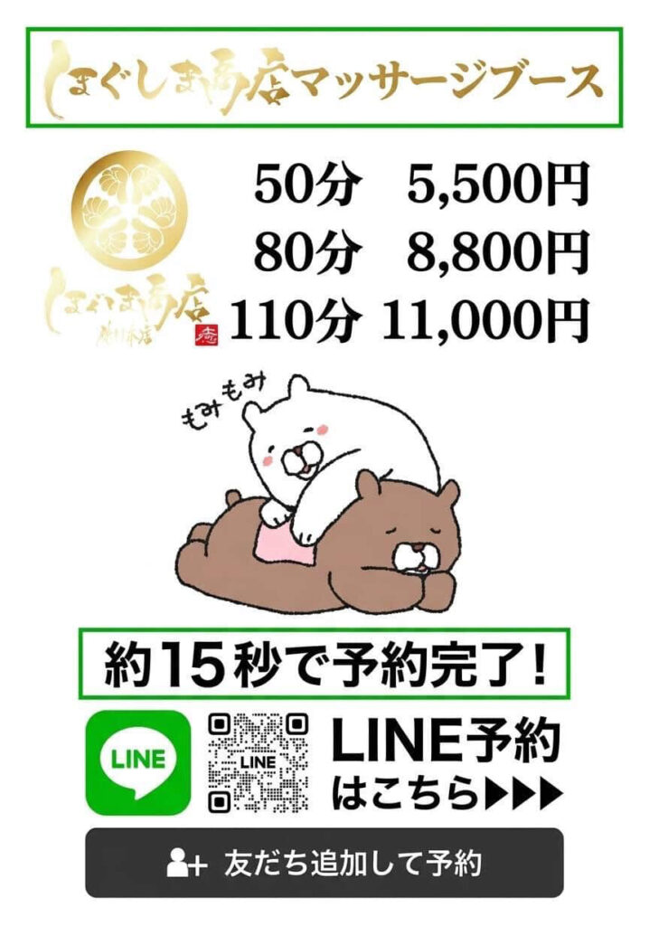 料金やコースなど詳しい内容はほぐしま商店さんの公式LINEからご確認ください。